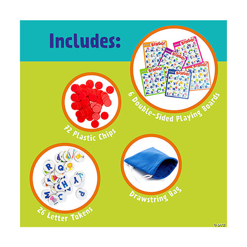 Enjoy a game that teaches the alphabet! This twist on classic Bingo helps kids learn and practice letter names and sounds. Reach into the bag and pull out a letter token—if you have a match, you're on your way to a bingo! It’s easy to play, with six boards so friends and family can join the fun.