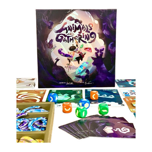 Animals Gathering is a dice family game for 2-5 players that incorporates dice management, tile placement, set collection, and push your luck elements. The goal is to earn the most points by placing magic stones in Animal Index Cards to revive animals, which in turn provide powers and points as your companion.
