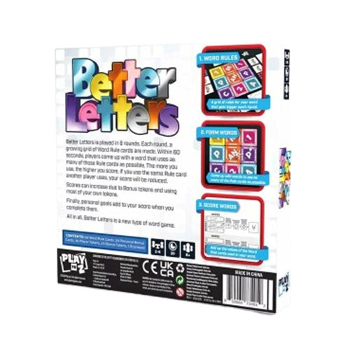 Better Letters is played in 60 second rounds with all players acting at the same time. Each playerβs goal is to form a word(s) by following the restrictions listed on one or multiple cards. You may begin with any card and continue utilizing cards connected orthogonally. Write down your word(s) on your score sheet in the corresponding boxes. All players must finish discovering up to three words before the timer runs out. When the timer expires, everyone makes sure they have one word checked from their list and will be the word they submit for the round.