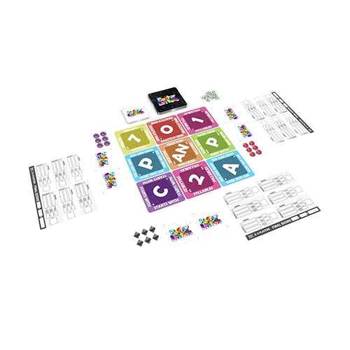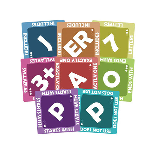 Come up with words that meet the criteria set forth by the Word Rule cards. Score points for difficulty and meeting personal objectives.