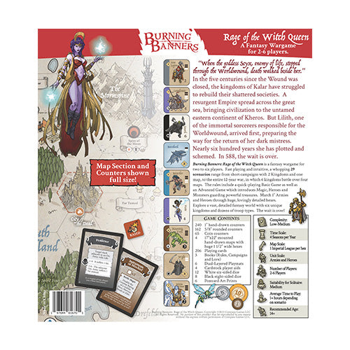 Burning Banners: Rage of the Witch Queen is a fantasy wargame for two to six players. Fast playing and intuitive, a whopping 29 scenarios range from short campaigns with 2 Kingdoms and one map, to the entire 12-year war, in which 6 kingdoms battle over four maps. The rules include a quick-playing Basic Game as well as an Advanced Game which introduces Magic, Heroes, and Monsters guarding powerful treasures.