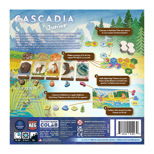 In Cascadia Junior, players take turns drafting habitat tiles and adding them to their environment. They must try to match the same habitats to grow their habitat corridors and score more points while creating groups of three wildlife icons on connected tiles. Once they make matches, they earn wildlife and habitat sighting tokens that they can add to their panorama board, where they will make their own personal picture of the Cascadian wilderness! At the end of the game, all players flip over their sighting tokens to discover the conifer cones they have collected. The player with the most cones wins!