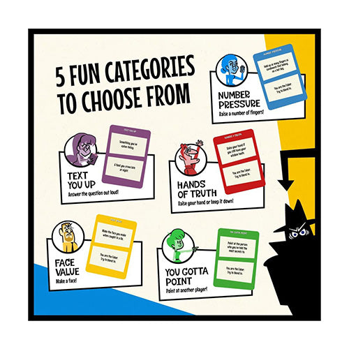 PLAY WITH 5 CATEGORIES. Hands of Truth; Players must either raise their hand up or keep their hand down. Number Pressure; Raise a certain number of fingers, between 1-10. You Gotta Point; Point at another player, or even yourself. Face Value; Make a facial expression. Text You Up - Each player must answer the question on their card out loud, truthfully.