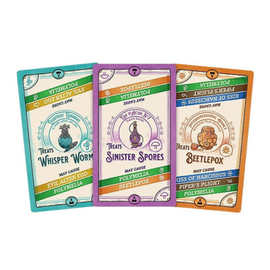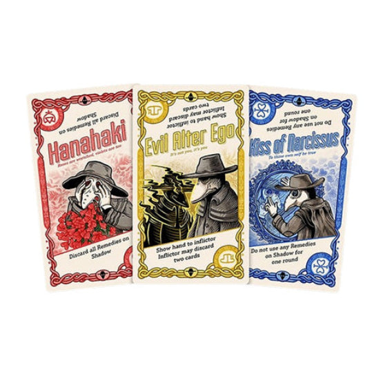 The rest of the Hex cards are shuffled in with the larger deck. Then, deal four cards to each player (concealed in hand). Start your turn by drawing two cards. You can make two actions on your turn. If you have in your hand a Remedy card that treats one of your hexes, you can place it on top of that Hex. You're now closer to winning β but watch out! Every Remedy contains a list of side effects (other Hexes) that you are now vulnerable to receiving from other players on their turns.