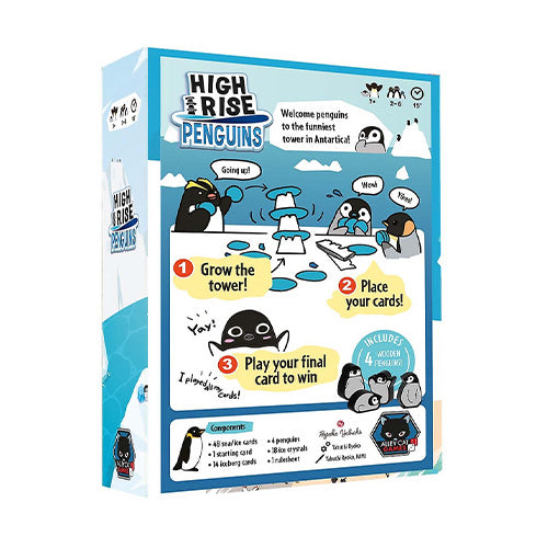 Uno meets Jenga in this card-based stacking game. Play cards and force your opponents to take actions including adding icebergs, ice crystals, and penguins to the tower. Use up all the cards in your hand, while keeping to tower standing, to win!