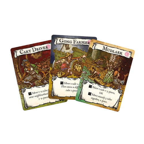 By night, Labourer cards will be used to carefully manoeuvre waste cubes through the narrow streets of London to turn a profit and to recruit workers.
