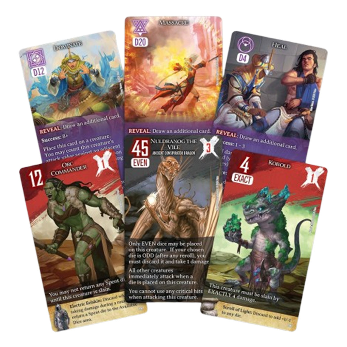 Face a gauntlet of iconic Pathfinder monsters, either solo or with up to 3 friends, using a set of 7 polyhedral dice as your weapons! Use the included set or any of your favorite standard sets! It's perfect for travel, as all you need is dice and the deck of cards!