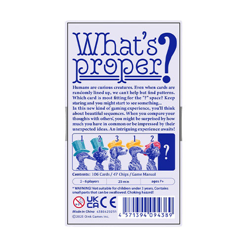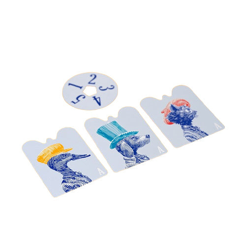 This is a game about pattern recognition, perception, and predicting what other players might feel is “just right.” During a round, create the card you think fits best. As you examine the sequence of animal, hat, and number combinations, you'll find yourself searching for any kind of pattern and symmetry to justify your proper pairings. If someone else had the same idea, you both score. There are no right answers... just what you think is the most "proper"!