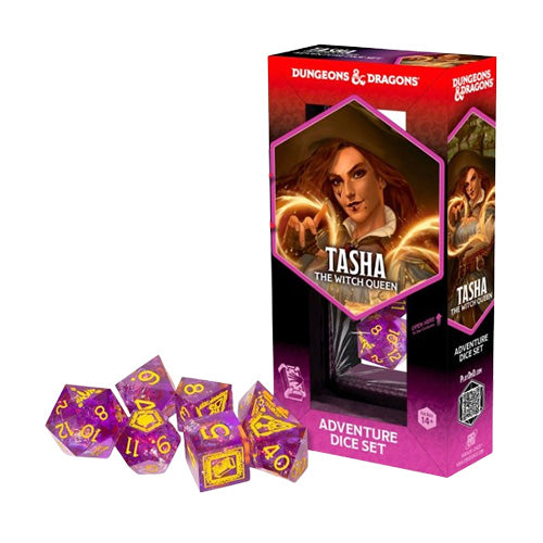 Step into the shadows of sorcery. The Tasha the Witch Queen Adventure Dice Set channels the cunning, chaos, and charisma of one of D&D’s most iconic spellcasters. This 7-piece polyhedral set is perfect for warlocks, witches, and anyone who laughs mid-incantation. Whether you're casting Tasha’s Hideous Laughter or weaving wild magic, these dice are laced with arcane attitude.