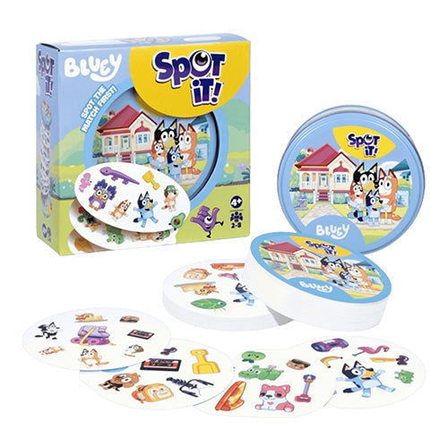 This fast-paced fun family game of observation and quick reflexes is ideal for players aged 4 and up. Be the first to spot the only matching Bluey character symbols between two cards to win! Spot some of your favorite Bluey Characters like Bluey, Bingo, Chilli, Bandit, and more. Cards come in a keep safe "Spot It!" tin. Includes 55 playing cards and is a great game for 2-8 players, making it the perfect party game!