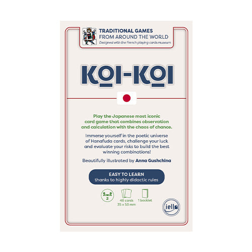 | Combine observation and calculation with the chaos of chance. In Koi-Koi, each turn, capture cards from the center of the table using those in your hand to form the best combinations (called “Yaku”) and end the round with maximum points. At the end of the game, the player with the most points wins! Between the calm of observation and the tension of chance, let yourself be transported by this emblematic game. Challenge your luck and evaluate your risks to build the best winning combinations! Contents: