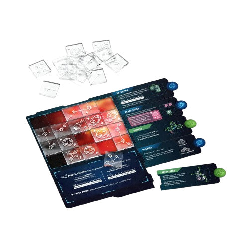 In the tile-laying game Twinkle Twinkle, you'll fill your star chart with clear plastic tiles, trying to connect constellations, build belts of asteroids, collect comets, pick up planets, and study them with satellites. Take care with those pesky black holes...unless you have a perfect spot for them, of course. Whoever finds their highest score in the stars wins.