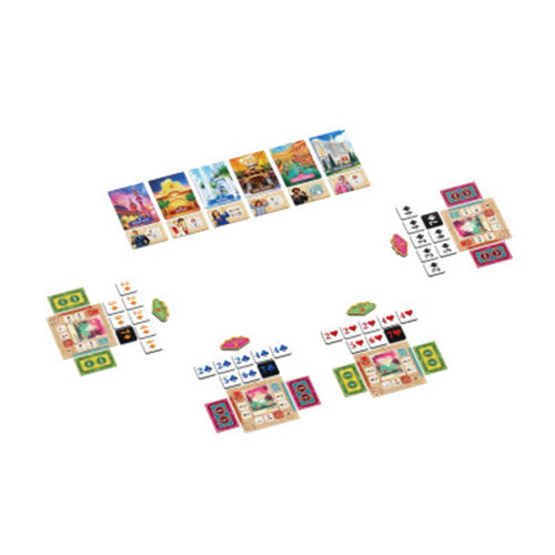 In this 2-6 player bluffing game, players have hidden information about which casinos are corrupt. Take turns playing money tiles (two 2’s, two 4’s, one 5, one six, one seven) into the different casinos.