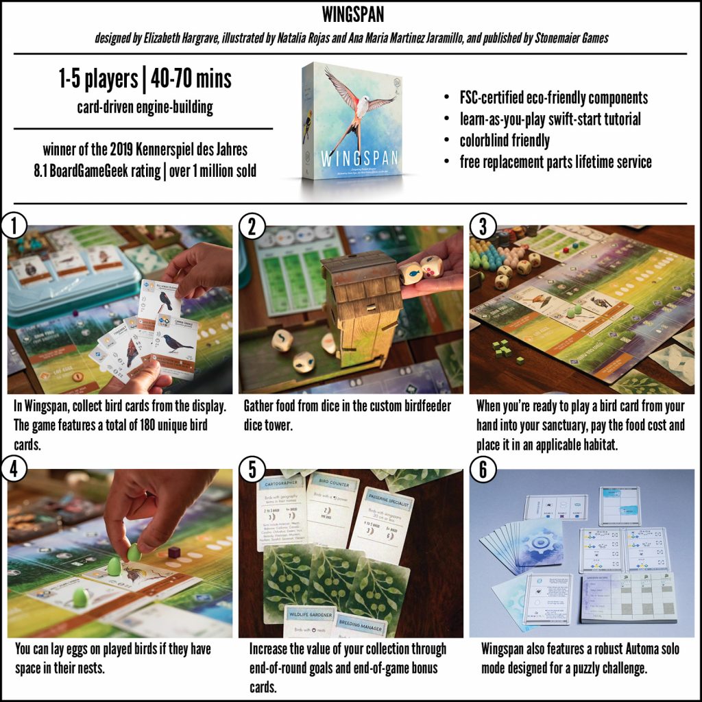 Wingspan is a competitive, medium-weight, card-driven, engine-building board game from Stonemaier Games.